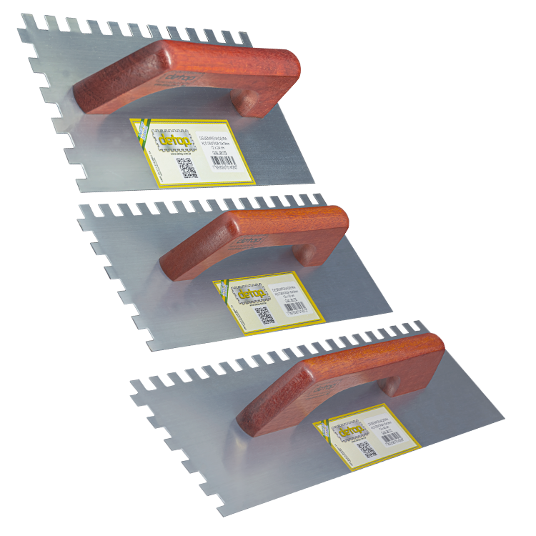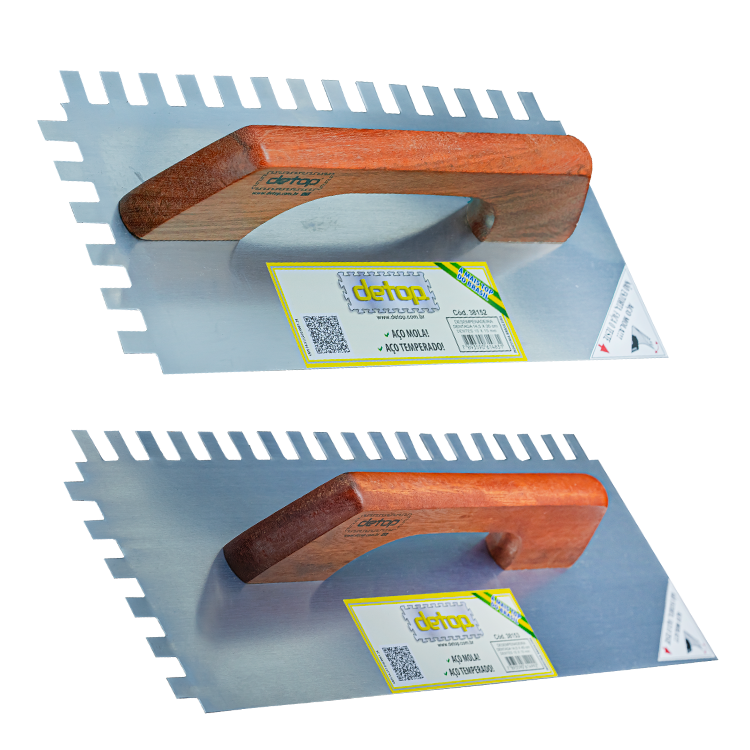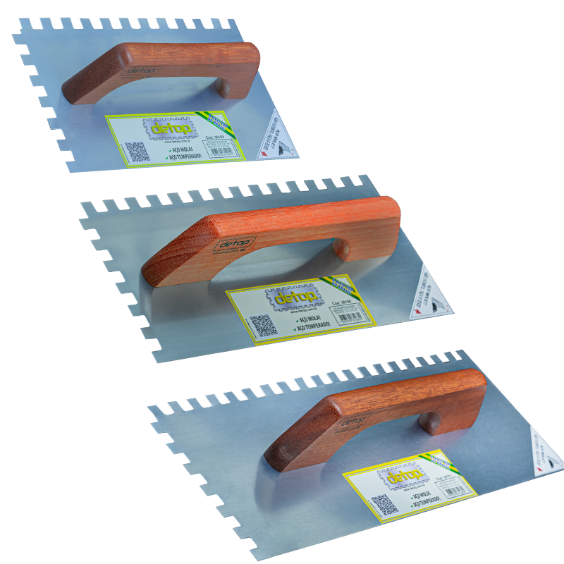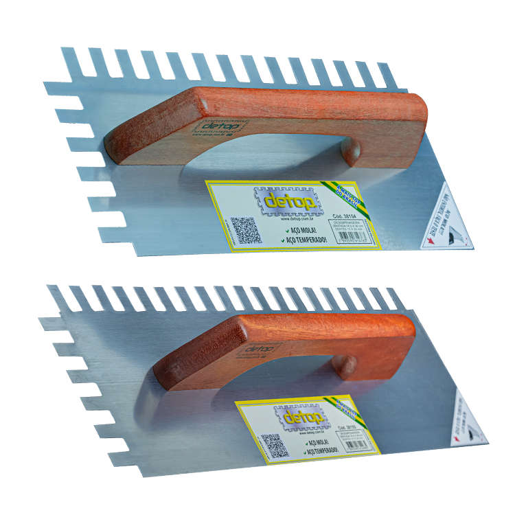 Desempenadeira DENTADA, lâmina em aço tradicional e cabo em madeira tratada e im- permeável.