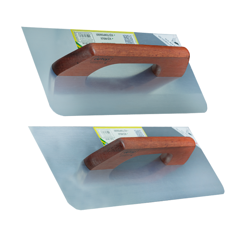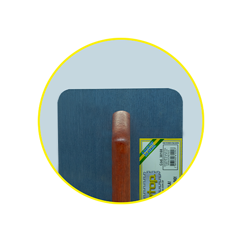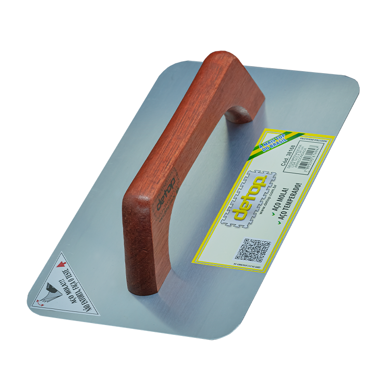 Desempenadeira lisa com cantos em dois formatos, um lado retangular e outro arre- dondado em 90 º. Lâmina de aço mola temperado e cabo em madeira tratada e impermeável.