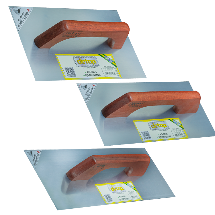 Os 4 cantos arredondados em 90º não afundam pra dentro da massa, evitando riscos e mar- cações que facilitam o lixamento posterior em determinadas aplicações, agilizando o trabalho e tornan- dose ideal para efeitos decorativos. Fabricada com um aço diferenciado, aço mola temperado! O mesmo aço utilizado em facas, serras e discos de corte. O aço mola temperado possui maior durabilidade e re- sistência, tanto nas ações de uso do produto, bem como nas ações quimicas do cimento, gesso, massas e aditivos diversos presentes nos produtos da conctrução civil. Posui o efeito mola! Ou seja, não entorta, é flexível ao ser forçada e pressionada durante seu uso, e assim permanece, dentro dos limites das uti- lizações para o qual o produto foi desenvolvido. Base reforçada com 2 parafusos. Cabo em madeira leve, reforçado e tratado para se tornar impermeável (não absorver água e umidade)
