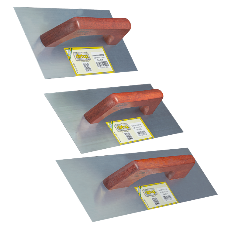 Desempenadeira lisa com os 4 cantos arredondados em 90 º. Lâmina de aço mola temperado e cabo em madeira tratada e impermeável.