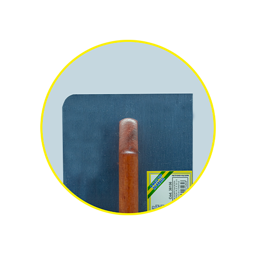 Fabricada com aço resistente as ações químicas do cimento, gesso, massas e aditivos diversos presentes nos produtos da construção civil. Lâmina fixada por parafusos, cabo em madeira leve, reforçado e tratado para se tornar impermeável (não absorver água e umidade).